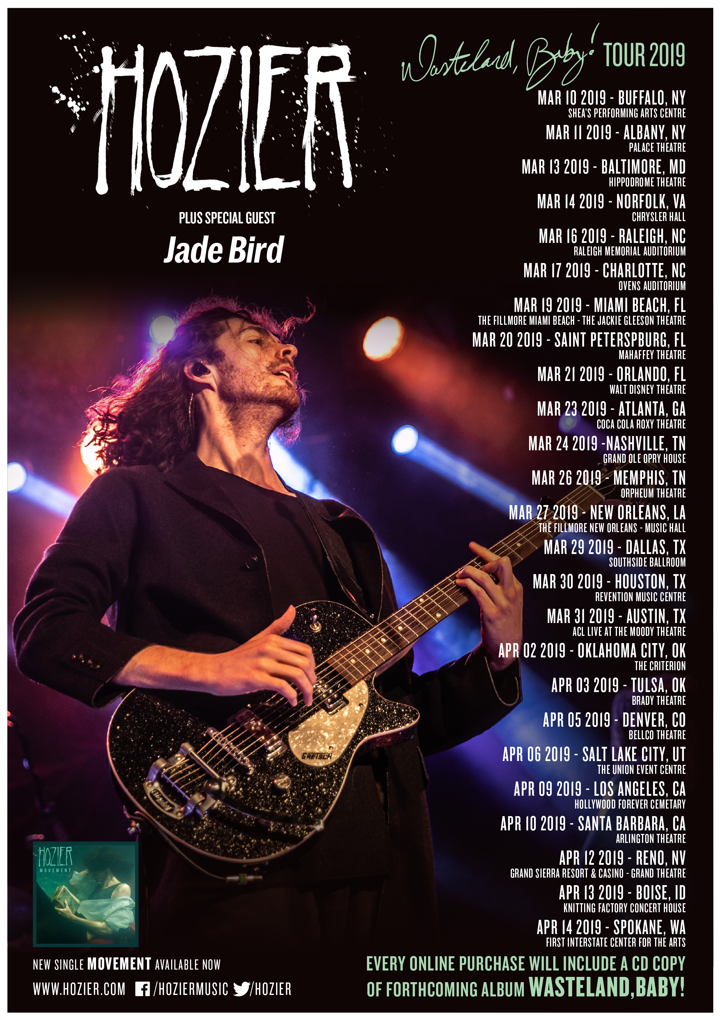 Every ticket purchased online for the just-announced headline dates will include a CD copy of Hozier’s forthcoming album Wasteland, Baby! Fans will also have the option to upgrade their CD to a standard LP copy of the album for an additional charge.